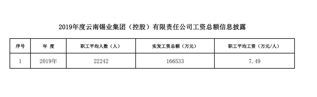 2019年度云南錫業集團(控股)有限責任公司工資總額信息披露