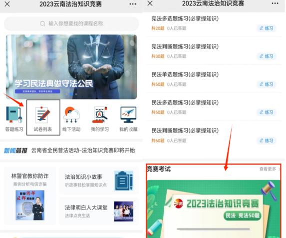 步驟六:在學習獲得60分積分后,可通過“首頁”的“試卷列表”欄目參加線上競賽答題,或在“首頁”下滑頁面點擊“競賽考試”參加答題。競賽答題共50題,含判斷、單選、多選三種題型,考試限時30分鐘,總分100分。