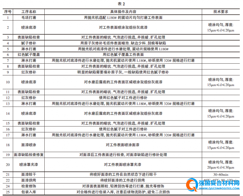 涂裝工藝二是在常溫下對毛坯件整面打磨后進行底漆噴涂,歷經至少三道以上表面缺陷檢查-補灰-水磨-底漆噴涂等循環工藝,由于玻璃鋼毛坯件的氣泡、暗坑等缺陷的檢查處理是在常溫下,不存在氣泡、暗坑收縮的情況,缺陷檢查處理循環的次數夠多,該工藝可以比較完整地發現并處理毛坯件的缺陷,有效保證面漆前的質量狀態。