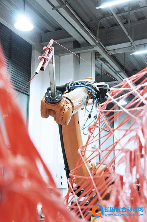 整個裝置由玻璃纖維復(fù)合材構(gòu)成,色調(diào)以漸變紅色為主,由下往上從淺紅到深紅,創(chuàng)造出空間的溫暖感,也仿佛靈感的火焰。最后這個裝置直徑八米,最高高度達到3.4米,采用形式結(jié)構(gòu)一體化的設(shè)計,分成了16組纖維模塊,而總重量僅為240公斤。裝置采用了機器人數(shù)字化建造技術(shù)來完成。
